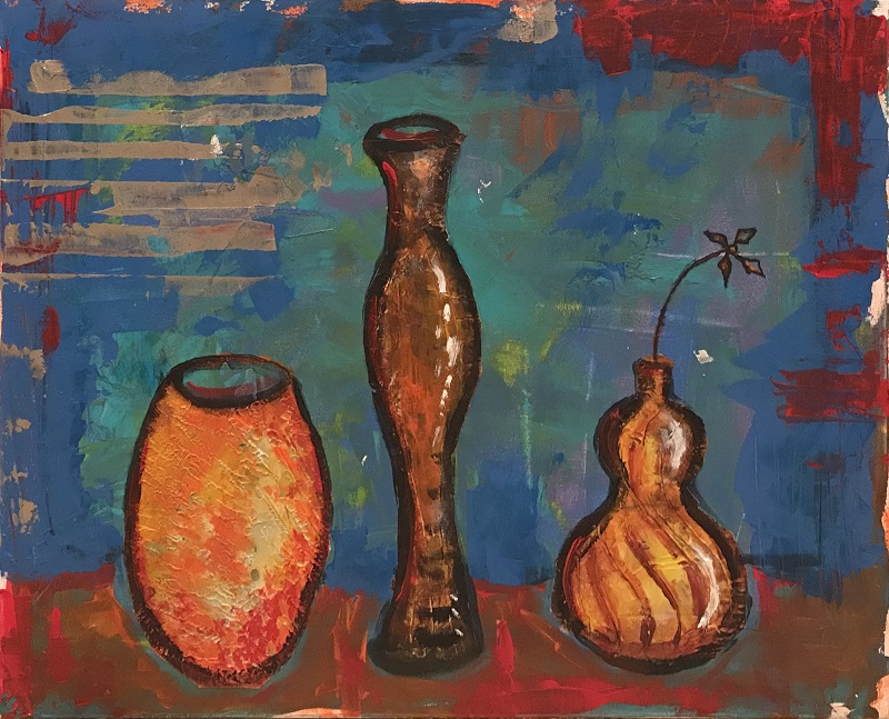 I was traveling in Peru and was fortunate enough to visit an artist's studio. The artist made amazing clay pots. Besides the amazing paint work on the pots, I was also taken by the imperfect shapes. The artist seemed unconcerned with making the perfect pot which gave each pot character, uniqueness, and a feeling of freedom. These pots inspired me to paint this painting.